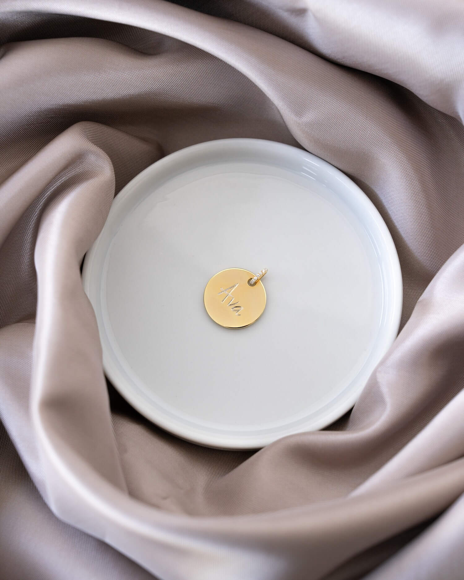 Whether classic or modern, our round pendant necklaces for babies/children with personalized necklace engraving are the perfect companion. Our precise engraving technique makes every piece of jewelry unique - whether names, initials or symbols. Make your piece of jewelry truly unique! These pieces of jewelry are available in various designs: engraved necklace, necklace with engraving, engraving plate or personalized necklace.