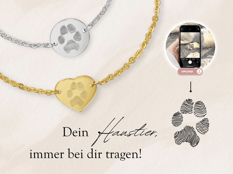 Onze graveerarmbanden voor dames - pootafdruk/neusafdruk hond - 925 zilver 18k verguld met graveerarmband zijn perfect voor iedereen die een speciale herinnering wil bewaren. Vereeuwig de poot- of neusafdrukken van je favoriete viervoeter als gravure op je sieraad. Een individueel cadeau of een uniek sieraad voor jezelf. Deze sieraden zijn verkrijgbaar in verschillende versies: gegraveerde armband, armband met gravure, gepersonaliseerde armband of identiteitsarmband.