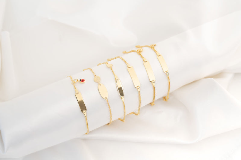 Ontdek onze klassieke gegraveerde baby-/kinderidentificatiearmbanden die je kunt personaliseren met gegraveerde armbanden. Onze nauwkeurige graveertechniek maakt elk sieraad uniek - of het nu namen, initialen of symbolen zijn. Elk sieraad is van de hoogste kwaliteit en gaat een leven lang mee. Deze sieraden zijn verkrijgbaar in verschillende ontwerpen: gegraveerde armband, armband met gravure, gepersonaliseerde armband of identiteitsarmband.